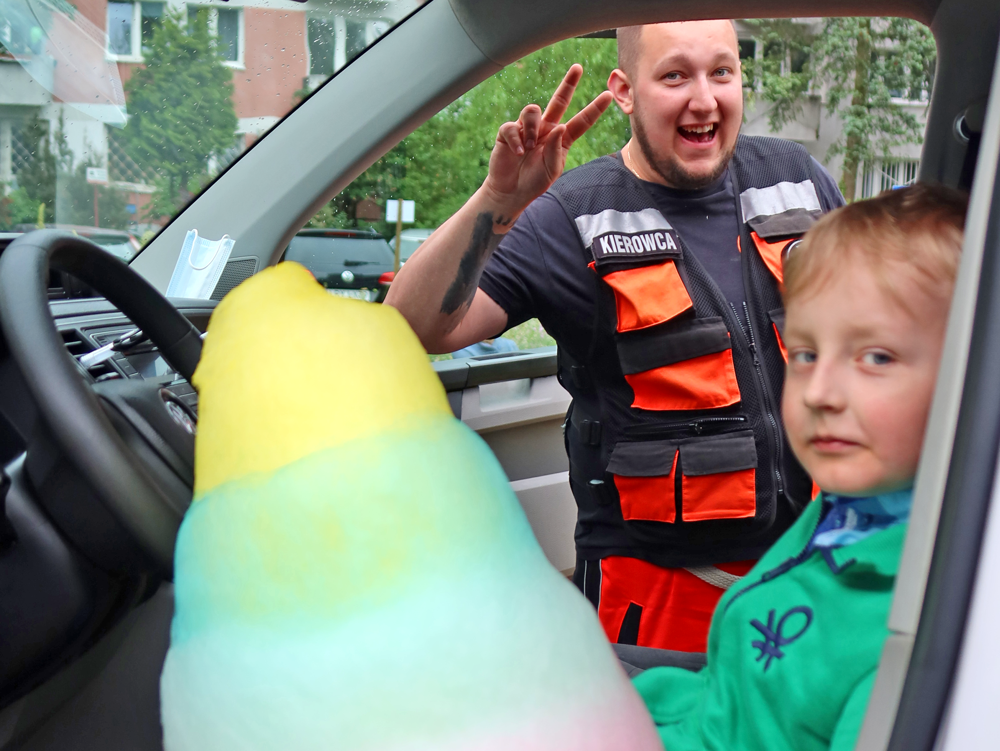 piknik rodzinny, namiot SPZZLO Warszawa-Żoliborz, chłopiec z watą cukrową w ambulansie medycznym
